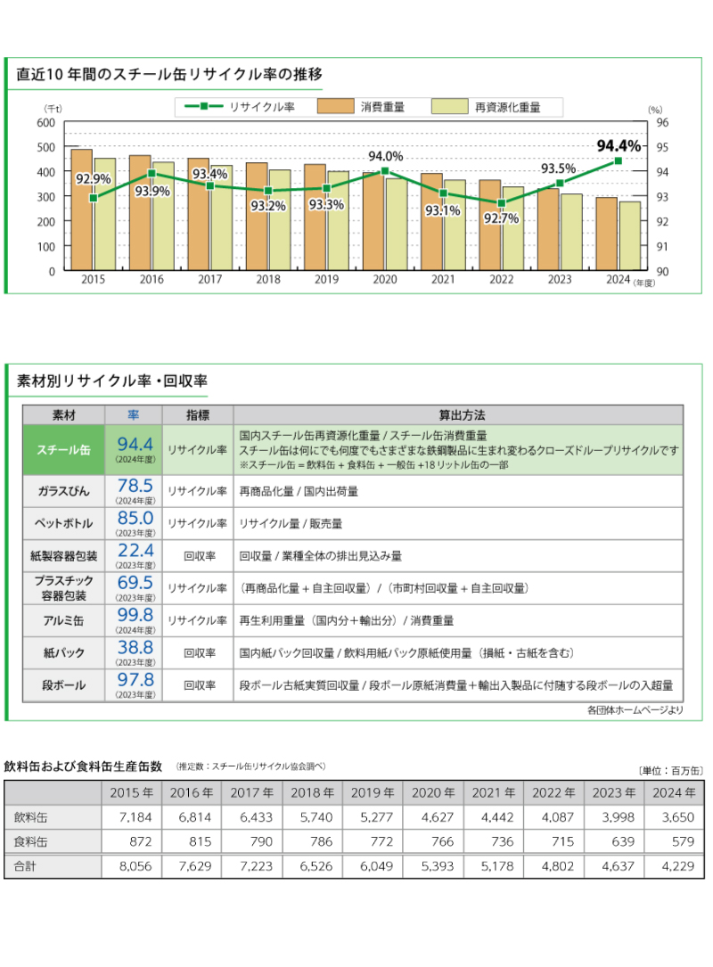 2024年度のスチール缶リサイクル率は2021年度から始まり2025年度を目標年度とする自主行動計画2025の数値目標「93%以上維持」を達成しました。