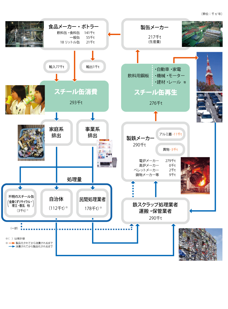 使用済みスチール缶などの鉄スクラップは、スクラップ処理業者等を経由し、製鉄メーカー(おもに電炉メーカー、高炉メーカー、鋳物メーカー)が原料として購入します。 建築用の鋼材、自動車用鋼板、冷蔵庫や洗濯機、スチール缶用の鋼板など様々な鉄製品に再生されています。