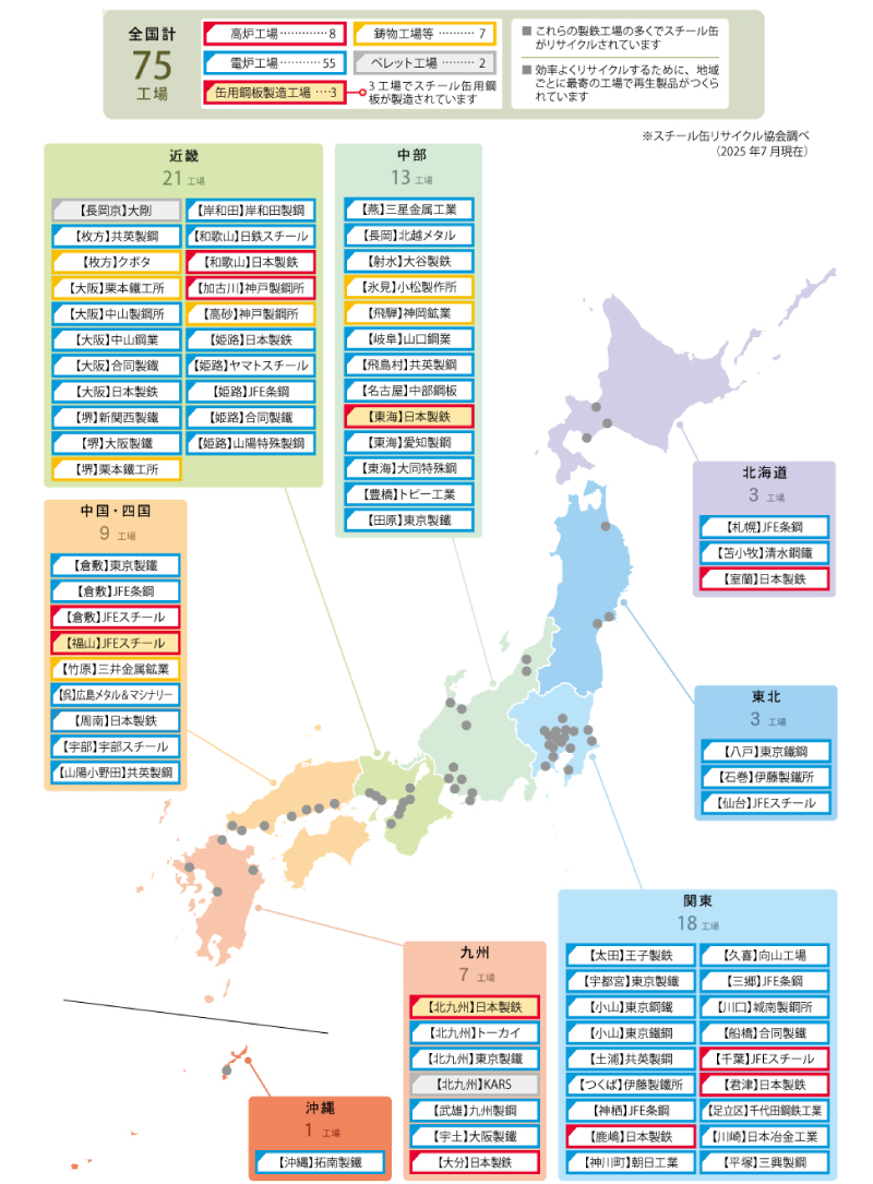 スチール缶のスクラップは、全国で73の製鉄工場で原料として使用されています。