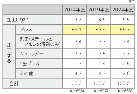 85.3%が「プレス」に加工されている。 一方、6.8% が「選別・加工はしない」で そのまま売却・処理している。