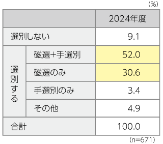 スチール缶を加工する前の処理工程では、「磁選+手選別」が52.0%と一番多く、次いで「磁選のみ」が 30.6%である。