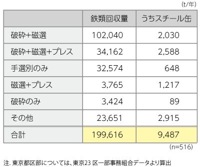 アンケートで不燃ごみからのスチール缶回収量(または鉄類回収量)に回答した516区市によると、2024年度実績で鉄類全体の回収量は合計199,616トン、うちスチール缶は9,487トンでした。