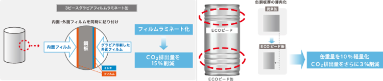 また、スチール缶をつくるときに排出されるCO₂の大半は、塗装・印刷後のオーブン工程で生じている。そこで、製缶メーカーはオーブン工程をなくし、印刷済PETフィルムのラミネート工程に置き換えた。内外面にPETフィルムをラミネートしているため、飲料などの内容物の品質を担保する上で不可欠だった内面塗装が不要になり、CO2排出量を大幅に削減している。例えば大和製罐(株)ではCO2排出量を、フィルムラミネート化によって15%削減するともに、缶胴板厚の薄肉化を可能にしたECOビード化によって缶重量を10%軽量化してCO2排出量をさらに3%削減し、合計で18%削減に成功している(図2)。